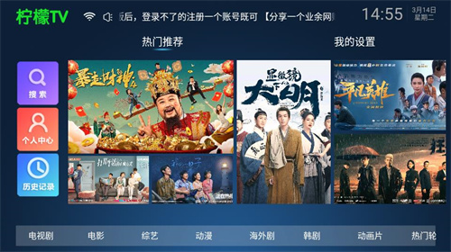 柠檬TV电视版是专为智能电视用户设计的免费影视资源播放软件,提供大量最新的电影、电视剧和综艺节目。用户可以免费观看高清画质的视频内容,无需花钱购买会员或广告费用即可享受高清流畅的观影体验。同时,柠酱TV电视版还支持多种设备使用,包括手机、平板和电脑等。用户可以通过该应用程序随时随地观看各种热门电影、综艺节目和其他类型的作品,满足不同的兴趣爱好并快速找到心仪的内容进行欣赏。