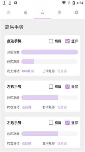 Kesture小横条app是目前最新推出的一款小竖条手机功能设置的应用软件,它主要是为一些经常需要使用的小伙伴们提供快捷的手势控制服务。该软件支持用户自定义手势操作、悬浮窗等各种实用工具的使用体验以及多种模式选择!