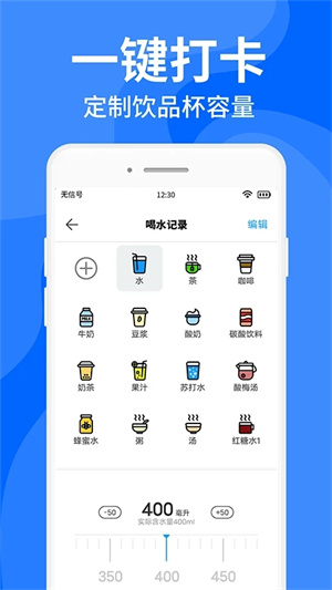 1、支持在线自定义定制个人饮水计划:您可以为每个用户制定专属的饮水量目标或个性化饮品清单;