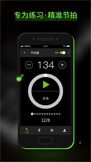 其他:除了基本的调音外,您可以尝试通过耳机直接从屏幕上滑块切换音频。如果您喜欢单独演奏某个歌曲,则可根据个人喜好的不同选择不同的节奏。如果你希望随时随地的练习,只需在几秒钟内就可以开始练习吉她们的所有乐趣。