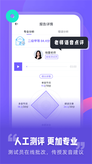 根据你的普通话等级量身定制了多维度评分方案,帮您查漏补缺,提高学习效率;
