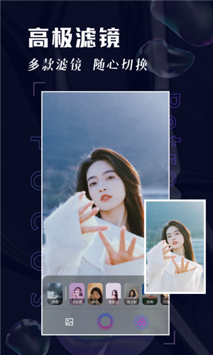 【自拍相机的灵魂】用手指轻触拍照,就能将你的美丽瞬间记录下来。拍照时选择相册中的照片,即可快速进行滤镜设置,让你的自拍变得更有趣。