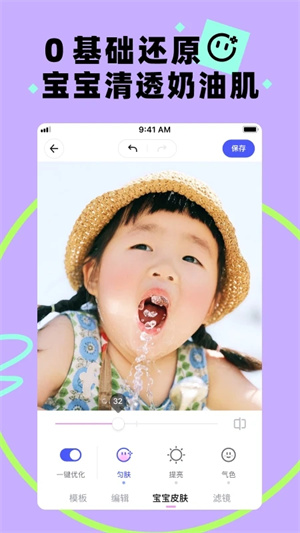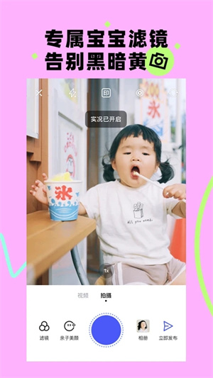 1.【滤波器】实时监控,滤色调整,让每一颗光芒都闪耀着你的活力值。从此告别夸克磨皮假脸,.【边拍边存】拍摄的照片自动备份,再也不怕丢失啦~3、【照片涂鸦】画作、漫画脸、手绘风都可以随便用~4、【一秒变身故事大咖】妈妈们的聚集地的社区,在这里你可以看到来自世界各地的美景、人物等精彩瞬间;5【照片拼图】多种布局模式,自由拼贴,让你的晒照不再单调无趣~6、【特效字幕】独家设计的字幕效果,海量字幕任你选。更有超酷炫的小表情包为你提供魔法特效哦!7、【图片压缩】一键快速压缩,节省更多存储空间。