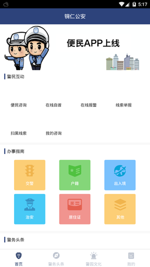铜仁便民公安为大众提供了一个网上办事大厅,市民们能够通过软件办理相关的业务。这里有最新的警讯信息、政务资讯以及民生服务等等!让市民可以及时了解本地的新闻动态!赶快来绿色资源网下载体验吧。
