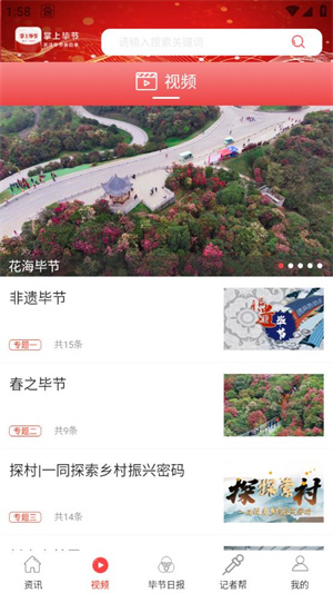 掌上毕节app是一个新闻阅读软件,用户可以在这里了解本地发生的各种新闻资讯。平台还开设了直播板块让用户观看电视节目和广播视频内容哦!感兴趣的朋友快来下载吧!