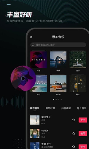 1、多样化的内容风格:提供包括电影、胶卷和卡通人物在内的多款热门流行歌曲和特效,涵盖不同的主题和风格。