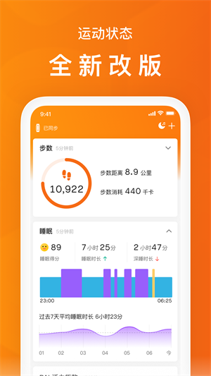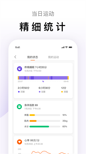 提供全面的健康检测:支持步数、心率、血压、睡眠、体重等各项身体身体数据的实时监测。