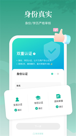 3、【安全绿色】:所有用户都经过实名的社交系统审核,保障用户权益。