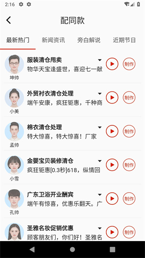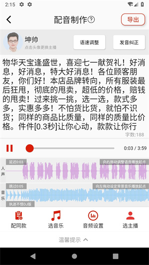 2、多种发音人选择:支持普通话及各种方言混合播报模式自由选取录制的声音并进行编辑和保存;