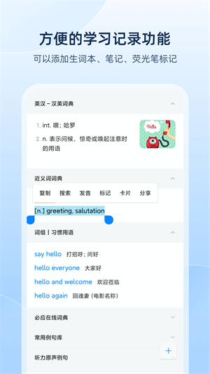 包含百万优质词库,云存储空间,跨终端取词、看词、写成语都支持;