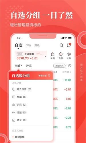 9、自选中心:添加自选列表中的股票或基金进行查看详情与购买;提供更多选择机会。