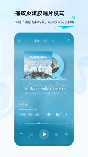 最大最好用的音乐播放器;:精选音乐推荐,最新最潮榜单,想听什么听什么;:为你定制数十个潮流频道,满足你不同场景的听觉需求;:主题色随着背景图而改变,更有多款皮肤任君选择;:独具特色的网络换肤系统,让你畅享换肤体验。