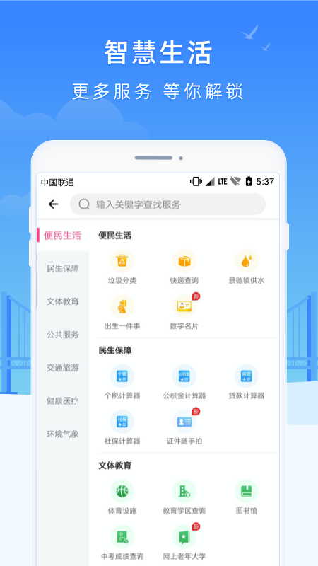 4、“首页”与“服务”,在这里您能看到最新最热门的本地化生活的服务讯息(天气预报),民生缴纳明细......给你想要的一切!