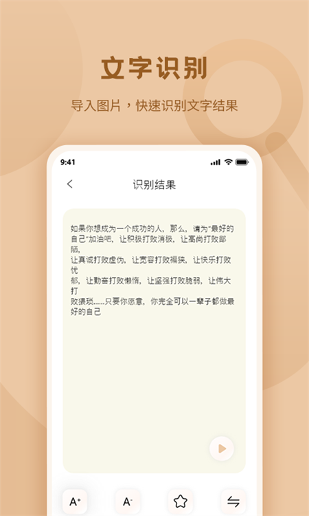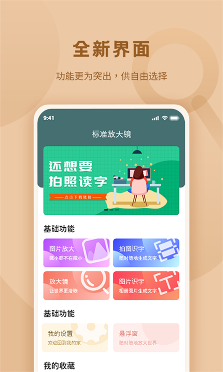 标准放大镜官方正版设计的操作界面简洁易用,适合初学者使用。这款应用提供了丰富的图片处理工具和强大的编辑功能。用户可以轻松地调整图片大小、添加特效滤镜等参数,打造出独特的图片效果。此外,它还提供了多种文字转换器供用户选择;例如,你可以根据需要将文字快速转换为可读的文本文件或导入其他格式的内容进行阅读并记录笔记。