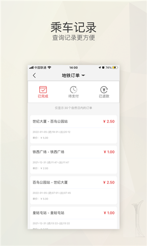 3、“扫码乘坐地铁”,打开App就可以进行地铁/公交卡交易记录了,让你了解每一次乘车时间。