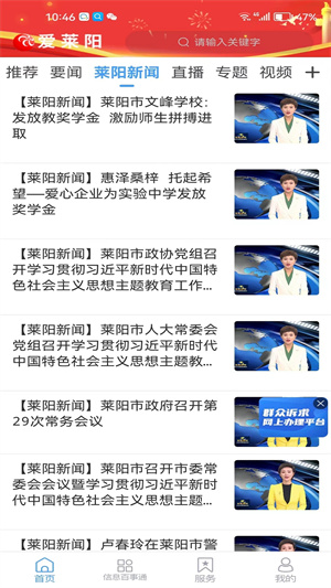 爱莱阳官方版使用生活服务APP是一款十分好用的手机本地软件。这款软件是为用户们提供莱阳市当地最新最全面的新闻和政务资讯、便民信息查询,让你足不出户也能知晓最新的本地新闻热点内容,同时它还支持在线缴费哦!需要的朋友赶紧下载吧~