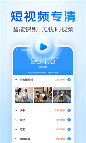 2、【视频专清】精准识别重复视频并分类整理出占用大量手机内存的视频文件。