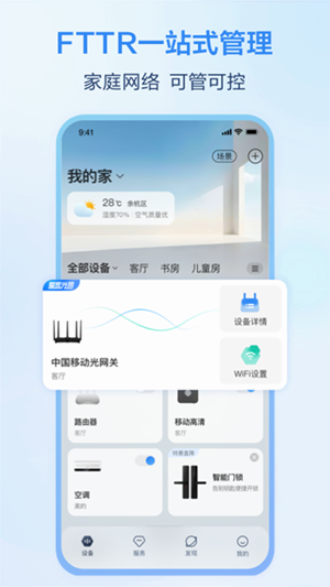 支持家庭路由器安装、网速测试、设备远程控制、电子围栏设置、在线报修等多种实用功能;