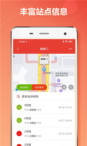 【首页入口】展示出西安市所有地铁线路详情页(包括最近线路),包含地铁线路上所有站点信息、首末班车时刻表、车站周边景点介绍以及地铁周边商家优惠促销活动。