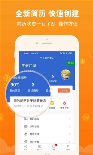 用户可以根据职位名称或关键字进行快速查询相关职位;同时支持按条件筛选简历类型并智能推荐适合自己的工作机会;