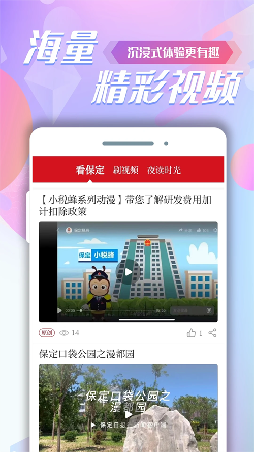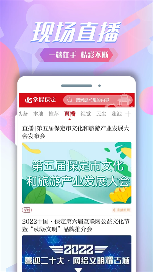 “掌上保定”,让“掌上保定”。通过手机APP端实现从新闻报道到电视节目回放的所有环节,真正做到“随时随地的视音频视频化”新方式,让你第一时间了解到新闻现场、***部门、社会机构、媒体机构等各类信息。