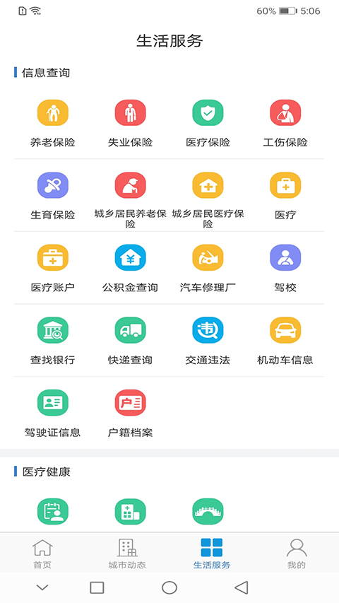 1、打开应用后进入首页中切换【城市】页面至左上方位置找到【社保卡充值】按钮选项。