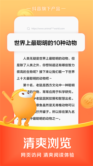 悟空浏览器极速版是抖音旗下一款超小、速度快的手机浏览器,相比于原有版本,体积更低占用。悟合浏览器极速版采用了全新的UI设计,给用户带来清爽的使用体验。该软件拥有海量视频内容资源提供给大家观看和使用,且内置了超强的广告拦截功能可以帮助大家更好的进行网页浏览!