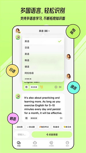 TalkAi练口语陪练平台是一款非常实用的手机在线对话互动工具应用程序,它可以帮助您轻松实现在线聊天的功能;通过该软件您可以在任何地方使用该功能以便于自己想法或表达问题而创建一个虚拟世界。该软件界面简洁明了,操作简单易懂,即使没有技术背景的用户也能快速上手!此外,TalkBaI练口语陪练平台还拥有强大的语言识别能力,能够将您的英语发音准确地转换成流利、清晰、专业的语音输出过程。无论你是需要提升语言技巧还是希望获取高质量的声音资源,TalkFouT都可以满足你的需求。TalkOUt是一个非常好用的应用程序,旨在于让您享受更愉快的学习体验,感兴趣的小伙伴欢迎前来本站下载使用!