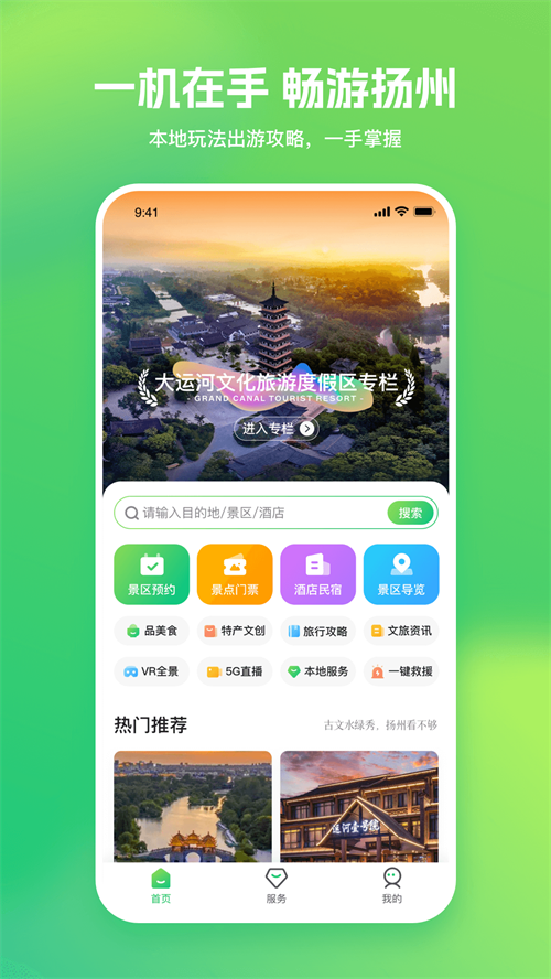 游扬州app官方版是扬州市文化旅游有限公司专门为游客打造的智慧出行软件,这款软件可以帮助游客在线查询景区信息以及门票价格等多种功能内容哦,还有很多便民服务和特色景点等等!