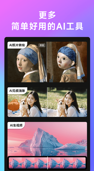 不仅如此,这款应用还提供了丰富的滤镜和特效资源供用户使用,包括自然美颜、复古风等多种滤镜效果,满足不同用户的个性化需求。无论是想要尝试新奇的风格,还是寻找灵感,这款应用都能让你的照片呈现出独一无二的效果。同时,该app还可以根据你的照片特点自动生成不同的风格,如风景、动物或其他,使照片更加生动有趣。