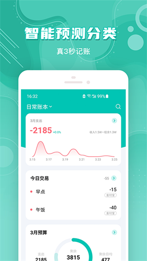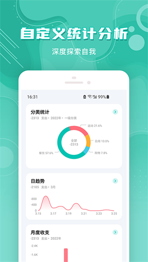 (如银行卡、现金等)及日历视图查阅每月收入与支出变化趋势,并且能根据这些趋势制定合理消费计划。