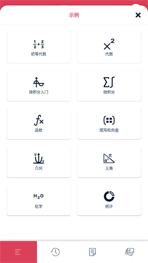 打开simbipnn计算器,进入到应用主界面中后我们可以看到有四个板块分别对应的是数学计算、数学计算、代数计算、几何计算和几何计算,点击左上角的加号按钮则会弹出一个窗口框,这里需要滑动屏幕查看更多详细的应用场景分类页面哦,同时还可以通过输入数字或者拍照的方式完成计算哟。