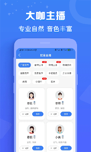 配音猫app是一款功能强大的手机文字转语音处理应用。软件支持多种发音人选择,用户可以轻松制作出各种各样的有趣的语音内容;同时还拥有海量的素材和模板可供下载使用哦!喜欢配音的小伙伴快来试试吧。