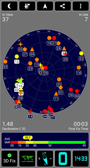 显示当前位置的经纬度和海拔;:根据需要选择路线并进行行驶;:查看路线上的详细信息;:可随时随地的查询某个地点的位置;:通过输入目的地后直接找到目标;:将当前出行线路与好友分享;:可以保存自己走过的路或步行情况;:展示你的运动轨迹及消耗的卡路里等数据;:显示当前和平均的速度、快慢参数设置;:在户外时为你提供精准的指向方向指导;:精确定位当前的方向;:查看卫星分布情况;:只需轻点一下,即可查找周边环境。
