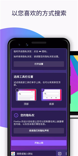 火狐浏览器手机版2024最新版也叫做Firefox,这是由谷歌推出的一款非常实用的手机移动端浏览软件。这款软件不仅拥有简洁直观的用户界面和流畅的网络体验,而且它还具有强大的隐私保护功能。用户可以通过该软件将浏览历史、书签以及密码同步到其他设备上,并提供个性化的上网设置选项来满足不同用户的口味需求。