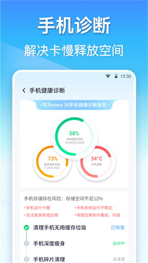 ★【手机加速】智能识别CPU占用情况,一秒提升性能; 2、【应用锁】防止重要应用偷窥,有效避免信息外窃; 3、【微信QQ专清】独有聊天缓存清理工具,聊天更顺畅; 4、【相似照片清理】精准定位并清理无良预装应用; 5、【超级省电】清理耗电进程,延长电池使用时长的细节。