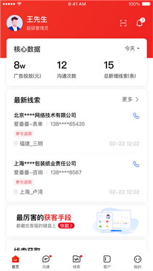 爱番番app最新版是一个非常好用的营销平台,软件功能非常强大,里面有大量的客户资源和销售线索可以帮助企业提高自己的效率。用户还可以在这里找到各种优质的客源信息内容来进行选择查看了解;还支持在线沟通交流、跟进订单等多种办公模式让您轻松完成工作任务哦!