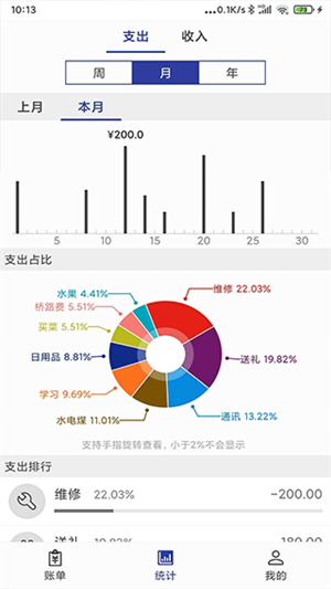 【智能报表】提供月度趋势图、饼图展现形式直观了解收支情况,及时调整计划.
