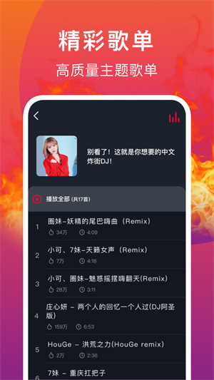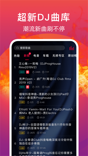 包括DJ舞曲、中文dj、英文mc、日韩粤语、电音串烧、酒吧慢摇、苏荷、喊麦、节奏、Remix、联想等。