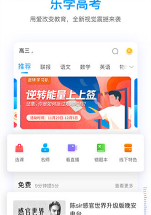 乐学高考APP是专为高三学生制作的手机教育学习软件,软件拥有丰富的课程资源、在线考试和智能测评等功能服务。可以帮助用户轻松提高自己成绩哦!感兴趣的用户欢迎前来下载使用体验。