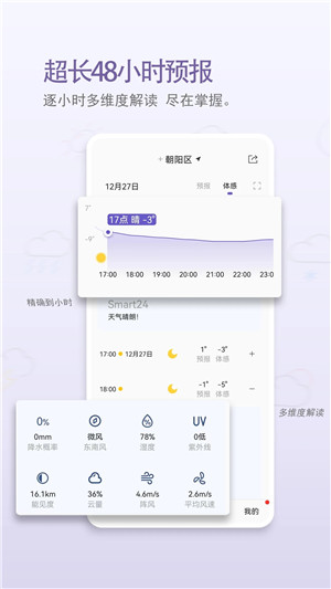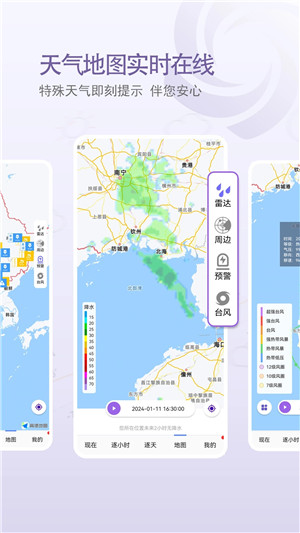 1、分钟级天气预报:24h逐个小时在线监控天气变化,从容应对各类突变天气需求。