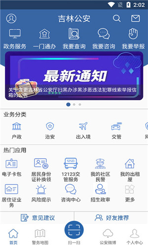吉林公安机关APP是吉林警察局面向公众开发的一款手机端综合服务的软件,提供在线咨询以及网上办事两大模块的功能;在该模块下包含了出入境申请、出入境缴费、户籍登记、出入境证件照打印、户口管理等功能,