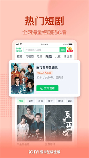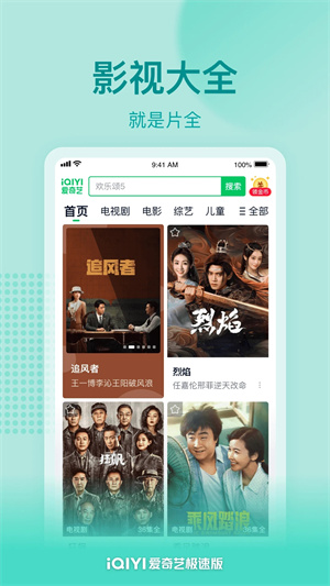 爱奇艺极速版是一款十分好用的视频播放软件,该软件内拥有海量的优质资源内容等着用户们来使用,超多的视频类型和分类栏目可以满足不同用户的观看需求,还有很多的影视剧、综艺等等在这里都有提供给用户们的观影体验哦,喜欢看剧的小伙伴们快来下载试试吧!