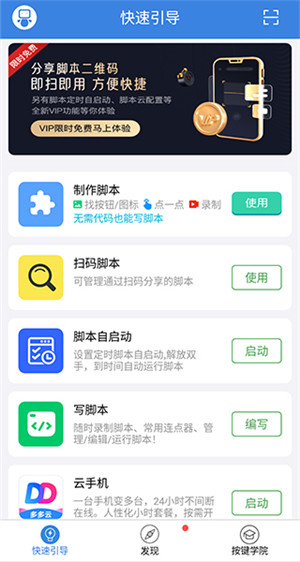 按键精灵手机版简单使用方便,无需root权限即可运行。软件功能强大,支持各种游戏辅助工具的自动点击、滑动操作等;还有很多脚本可以选择和编辑!
