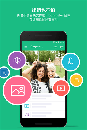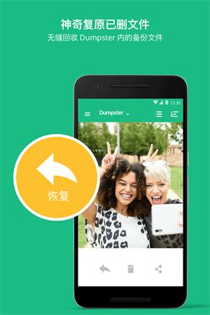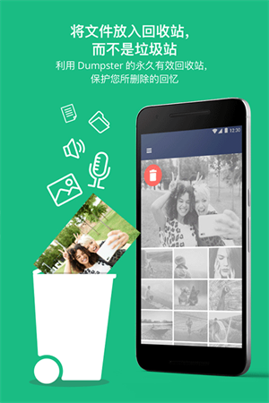 回收站Dumpster破解版是一款手机恢复删除文件的工具,软件可以帮助用户进行图片、视频以及其他重要内容的备份还原。软件界面简洁明了,没有任何广告打扰你的使用体验。需要的用户赶紧来下载试一试吧!