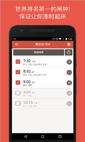 使命闹钟永久免费版不限时间设置闹铃软件是款相当方便的手机闹钟app,在这款app中用户可以自定义自己想要使用的功能和内容。我们下载就能直接开启自己的闹铃服务哦!喜欢的朋友不妨速速下载吧