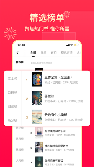 各类榜单随心换,玄幻修仙、都市爽文、言情穿越、盗墓探险、恐怖惊悚、穿越武侠、青春校园、网游竞技
