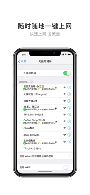 【WiFi万能钥匙】是基于云端的WiFi万能钥匙网络管理软件。内置逾十万条的wiif热点数据库,其中包含超过200个热点信息,遍布全国各地,以及上千万的移动热点及联通热点资源,覆盖中国大陆地区各大洲际地区。