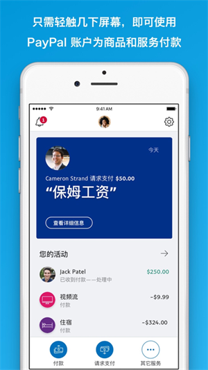 mobile推出的一款第三方支付工具。 PayPal安卓版客户端是一款由paypal官方打造的跨境购物平台,用户可以通过app来轻松购买海外的优质商品。软件功能强大实用,使用便捷易上手!欢迎大家下载!
