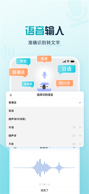 23种方言免切换,说话实时转文字。支持随声译、手动输入。